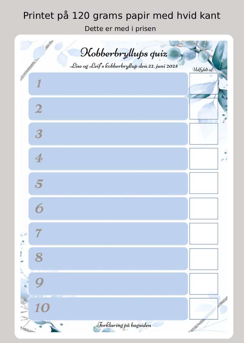 📜 Sådan gør I: Lad skemaet gå rundt blandt gæsterne under middagen. Alle, der har et godt spørgsmål til kobberparret, skriver det i skemaet. (Alle spørgsmål skal starte med “Hvem…”) Når der står 10 spørgsmål, afleveres skemaet til toastmasteren eller vedkommende som har quizzen med.