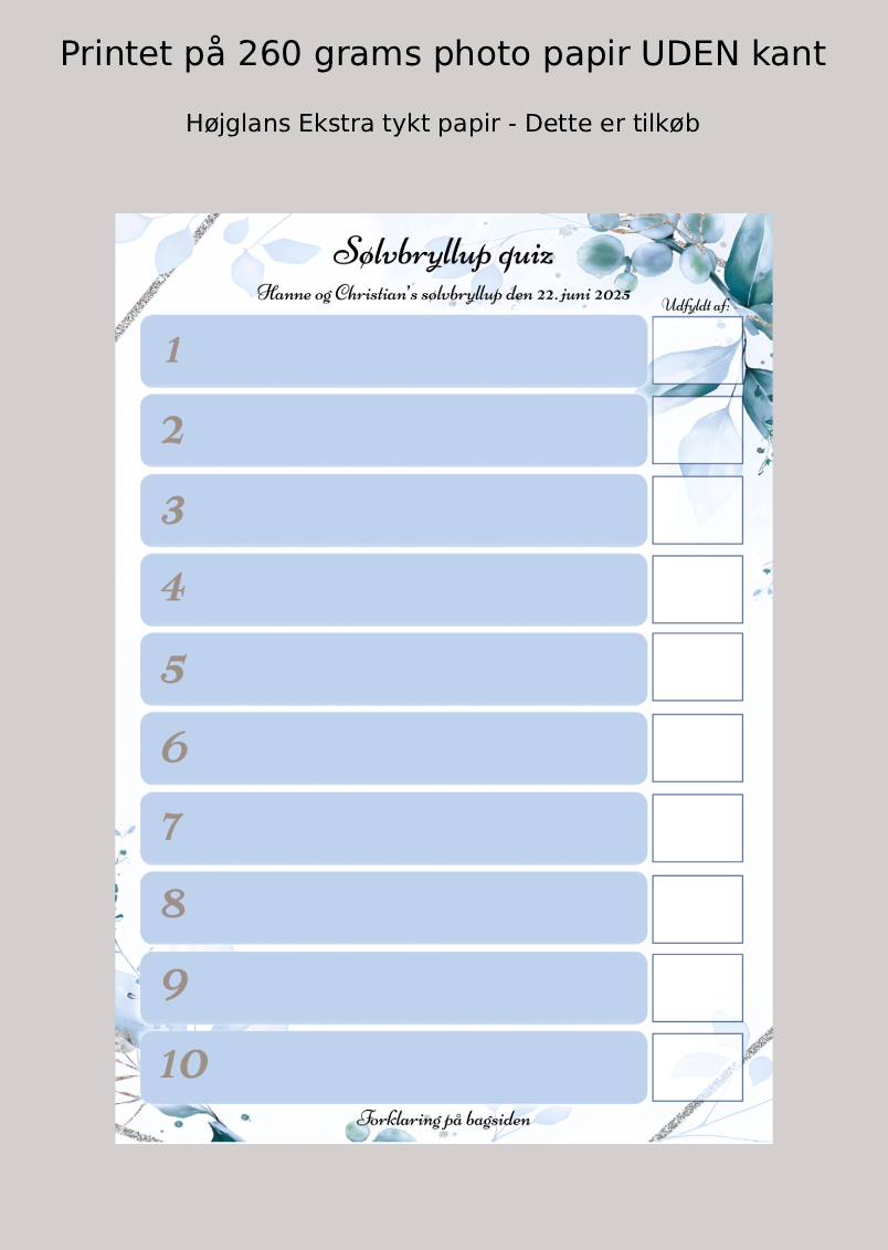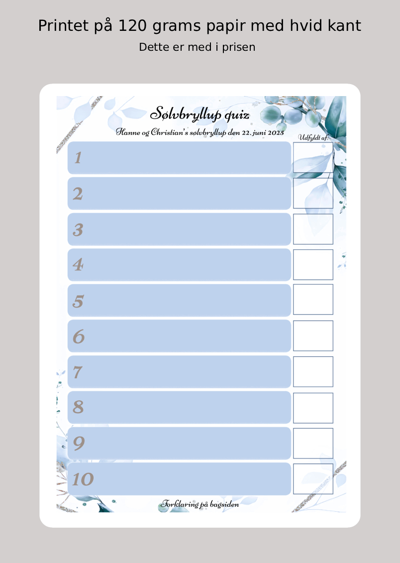 📜 Sådan gør I: Lad skemaet gå rundt blandt gæsterne under middagen. Gæsterne skriver sjove spørgsmål til sølvbrudeparret.