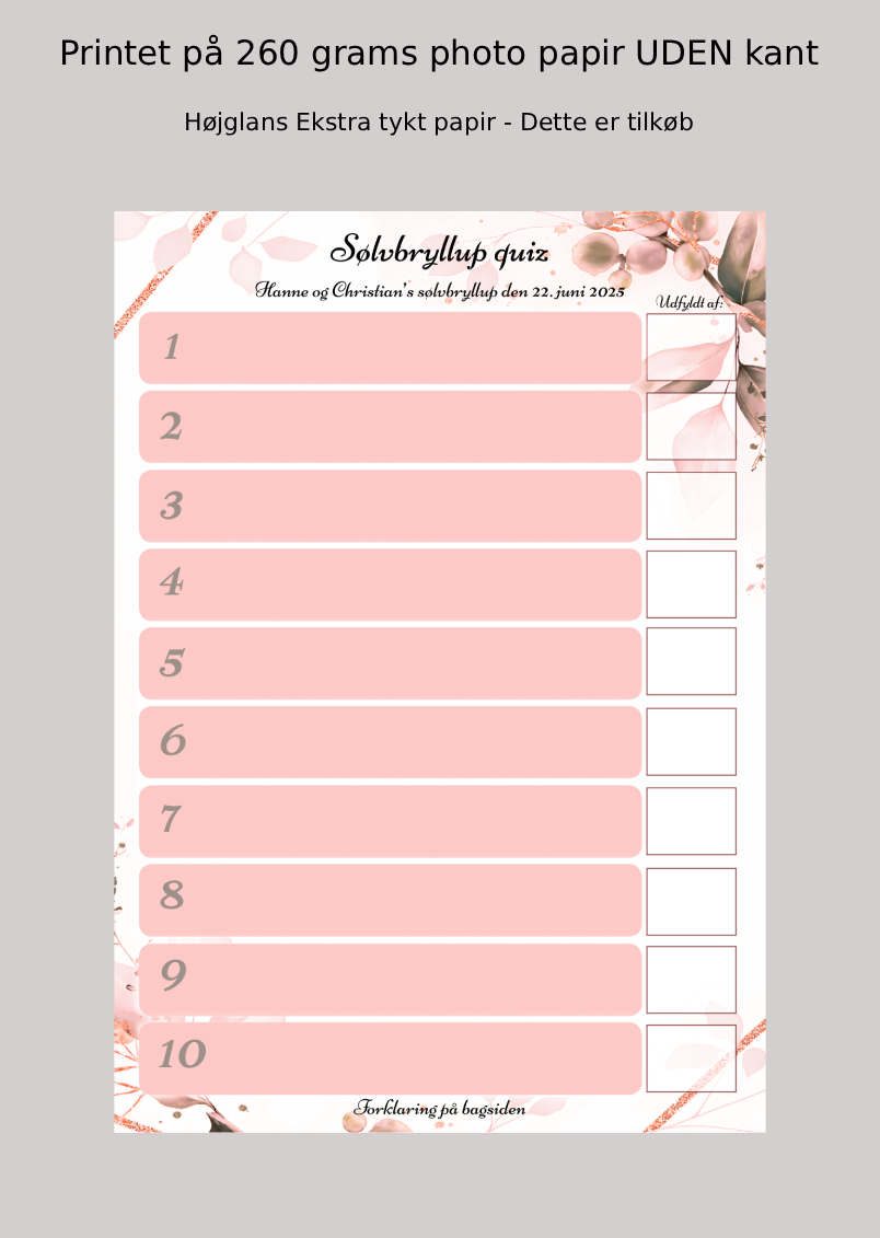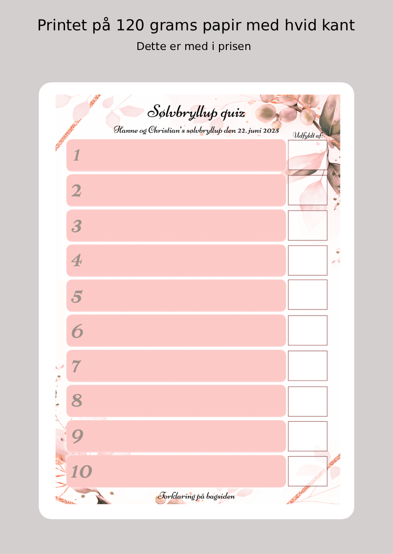 📜 Sådan gør I: Lad skemaet gå rundt blandt gæsterne under middagen. Gæsterne skriver sjove spørgsmål til sølvbrudeparret.